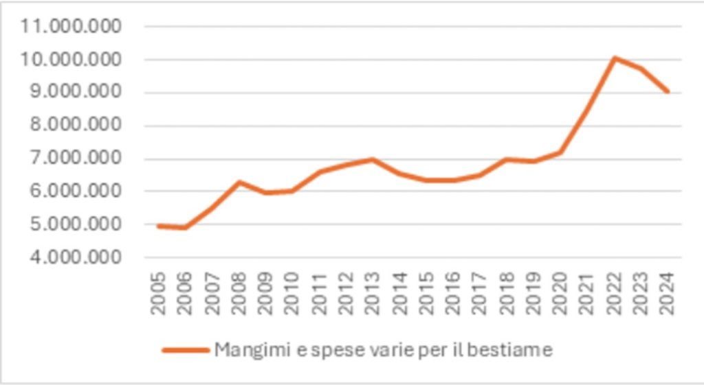Nel 2024 il valore della produzione degli allevamenti zootecnici italiani supera i 22,7 miliardi di euro, segnando un aumento complessivo del 62% rispetto al 2005 (ISTAT, serie storica 2005-2024). Tale crescita conferma il ruolo strategico del comparto all’interno del sistema agroalimentare nazionale. Tuttavia, nello stesso arco temporale, i costi per mangimi e spese varie per il bestiame registrano un incremento ancora più marcato, pari a circa +82%. Questa dinamica ha determinato una crescente pressione sui margini delle aziende zootecniche, soprattutto a partire dal 2021, quando l’aumento dei prezzi delle materie prime, dell’energia e dei trasporti ha inciso in modo significativo sui costi operativi. La crescita dei costi registra un picco nel 2022, che ha rappresentato un anno di forte stress economico per il comparto. Solo nel biennio successivo si osserva un parziale rientro dei costi, senza però un ritorno ai livelli pre-pandemici (fig.2).