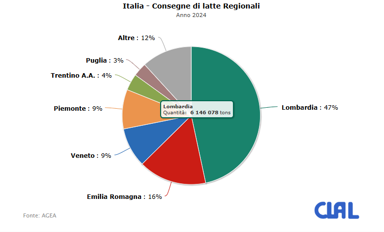 – Consegne di latte vaccino alle latterie a livello di regione, anno 2024 (CLAL.it)Ā