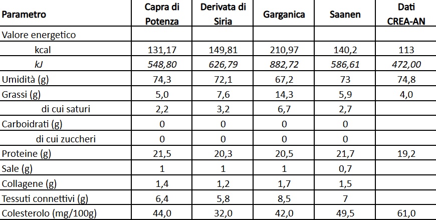 In generale, la Capra di Potenza (razza a rischio di estinzione) ha mostrato un profilo nutrizionale migliore rispetto alle altre razze, per contenuto in acidi grassi monoinsaturi e in omega-3, per il valore nutrizionale dei lipidi e per gli indici nutrizionali (aterogenico e trombogenico, che riguardano rapporti specifici di acidi grassi saturi e insaturi).