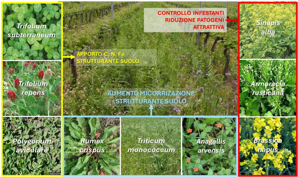 Altre specie erbacee, quali il poligono, la mordigallina, la romice o le cerealicole (farro), attraverso la micorrizazione radicale favoriscono la proliferazione di reti fungine nel suolo, che ne migliorano la struttura e aumentano la disponibilità di nutrienti in vigna.