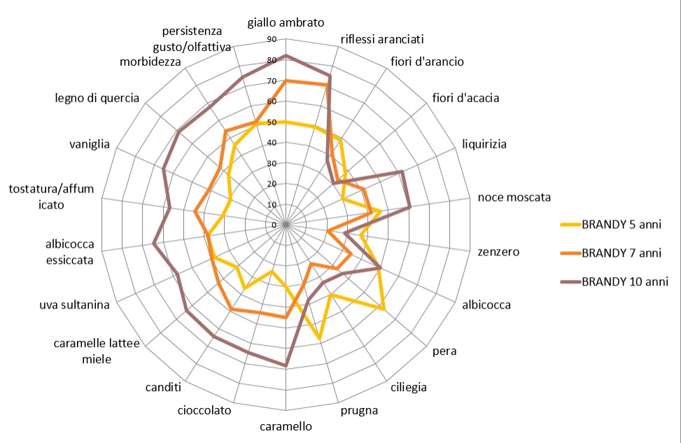 Come esempio, verrà presentata la caratterizzazione del Brandy Armeno condotta presso il centro, in cui è stato definito il profilo sensoriale in funzione dei diversi anni di invecchiamento. L’analisi ha evidenziato un’evoluzione progressiva e coerente: il colore passa da tonalità più chiare a sfumature ambrate più intense; al naso si osserva una transizione da note fresche e fruttate verso sentori più complessi, tostati, speziati e caramellizzati, legati anche all’interazione con il legno; al gusto si rileva un progressivo ammorbidimento, con maggiore rotondità ed equilibrio complessivo. Questi risultati, sintetizzati nella figura allegata, mostrano come il tempo di affinamento incida in modo determinante sul profilo sensoriale finale.